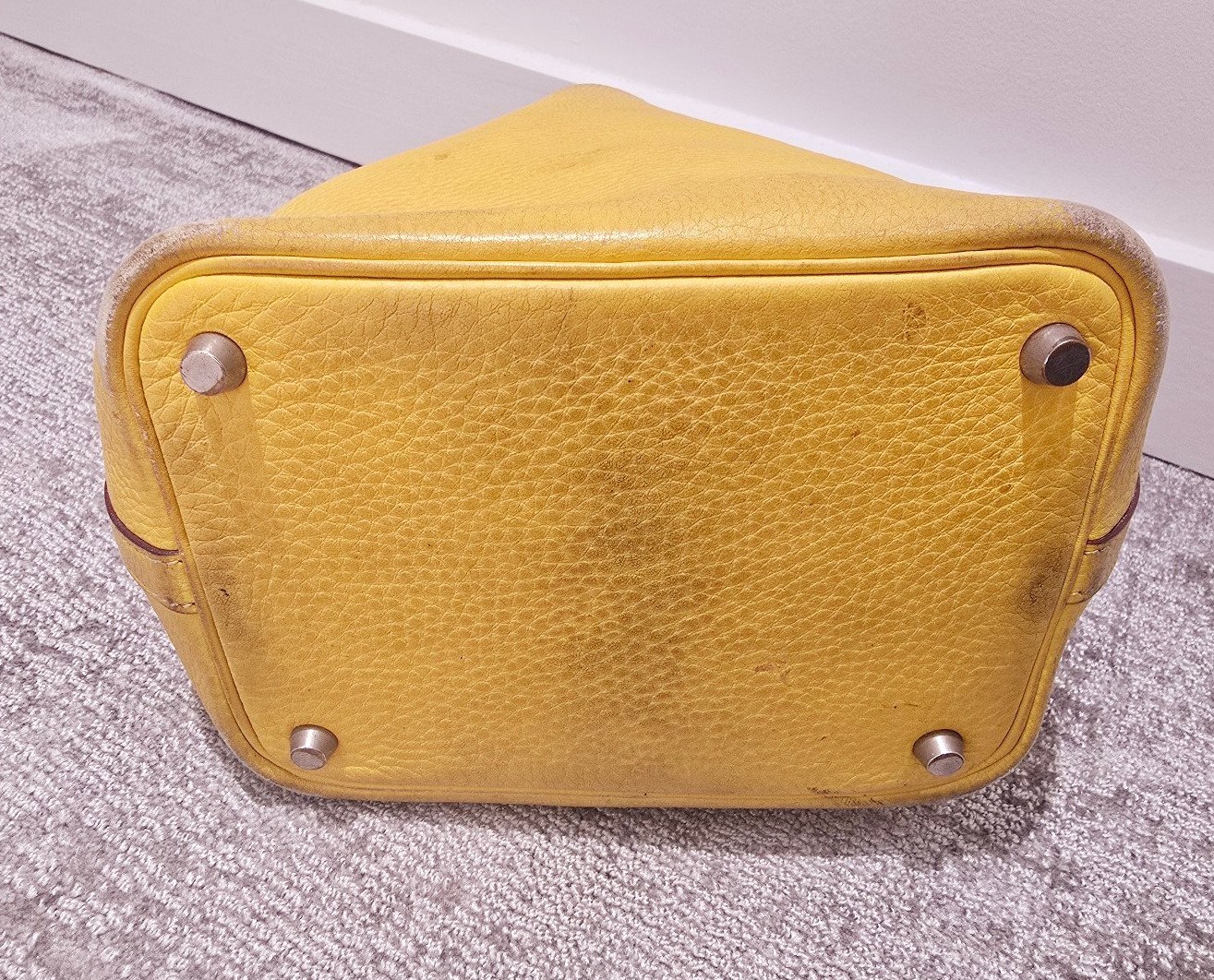 Selling at low price due to wear, as seen in pictures, the bag will need repair, the leather is cracking under the handles, and you may able to cover it with twilly. Authentic Yellow Hermes Picotin in PM, I've worn this bag almost daily, and the condition will not be for everyone. Please consider this before purchase as all sales are final.