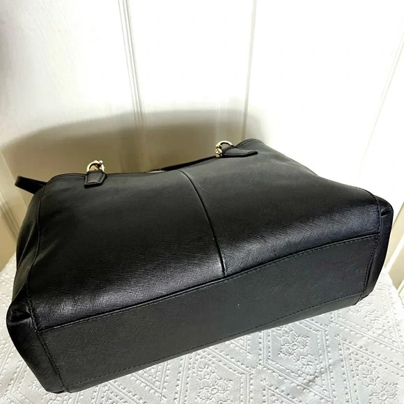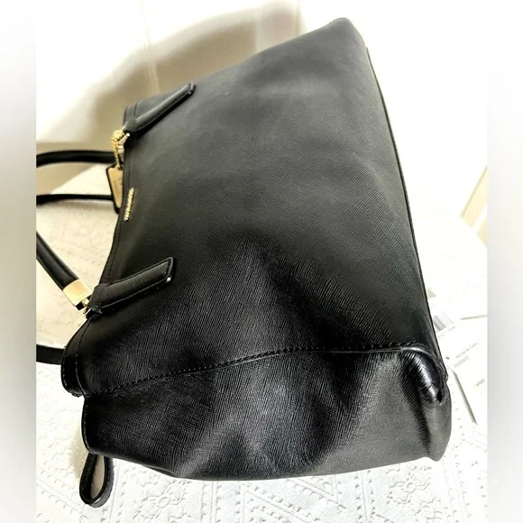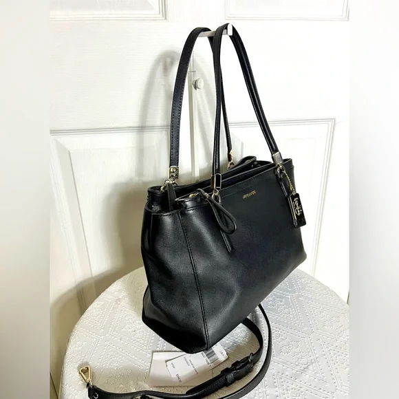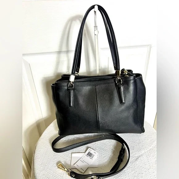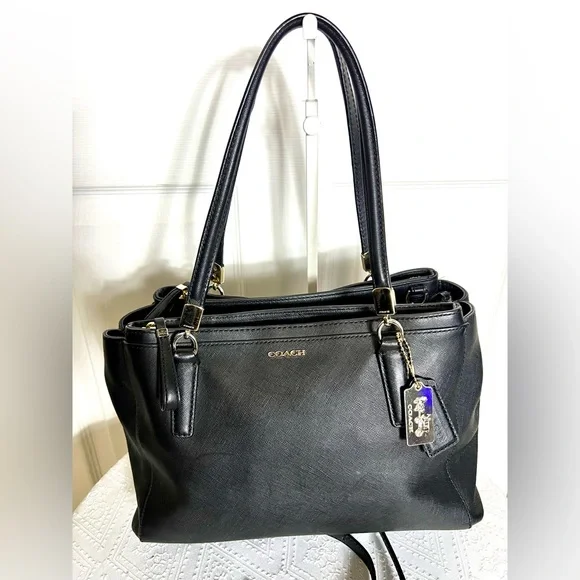 COACH Madison Saffiano Leather Christie Black Satchel 30128Kept in New Conditions with Tag and Cleaning instructions card. Please refer to all photos for details.Approximate Measurements: 15”L x 4”W x 9”HDouble Handle Strap Drop 8”LRemovable/Adjustable Shoulder Strap Drop 22”LMaterials: Saffiano Leather Colors: BlackGold Plated Hardware Leather/Gold Plated Coach Hangtag (2) Zipper Closure with Leather Pull (1) Magnetic Snap ClosureInterior Grey Satin Lining(3)Dividers Compartment Interior (2) Slip Pockets (1) Zipper Pocket(1) Center Large Compartment Please refer to all photos for details. We are quick shippers. Questions are welcomed. Thank you for shopping in our closet.Bundle and Save!