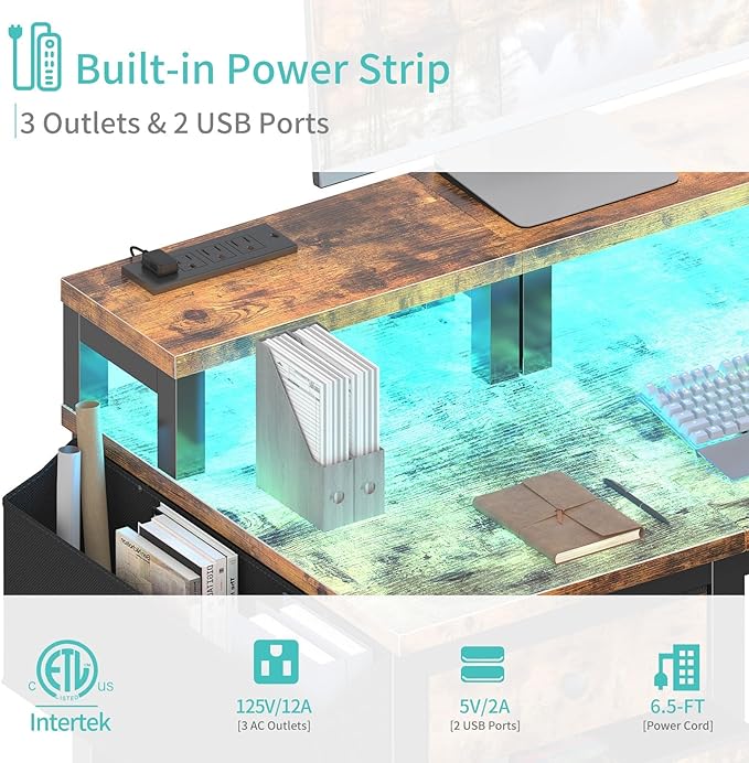 Computer Desk With Fabric Drawers, 47 H Home Office Desk With Monitor Stand, Reversible Gaming Desk With Led Lights And Power Outlets, Rustic Brown