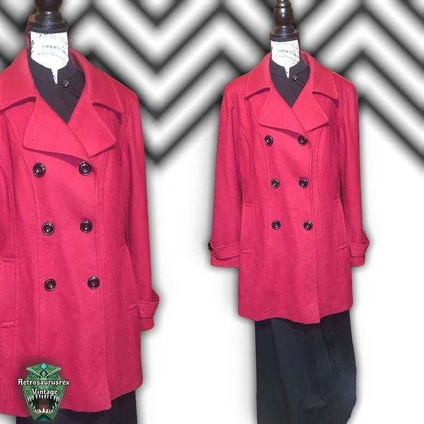 Retrosaurusrex Vintage; vtg; pea coat; retro; pinup; twee; rockabilly; autumn; fall; winter; business casual; career; office; volup; mod; classic; timeless; Croft & Barrow Retro Wool Blend Red Peacoat Jacket, Plus Size XL