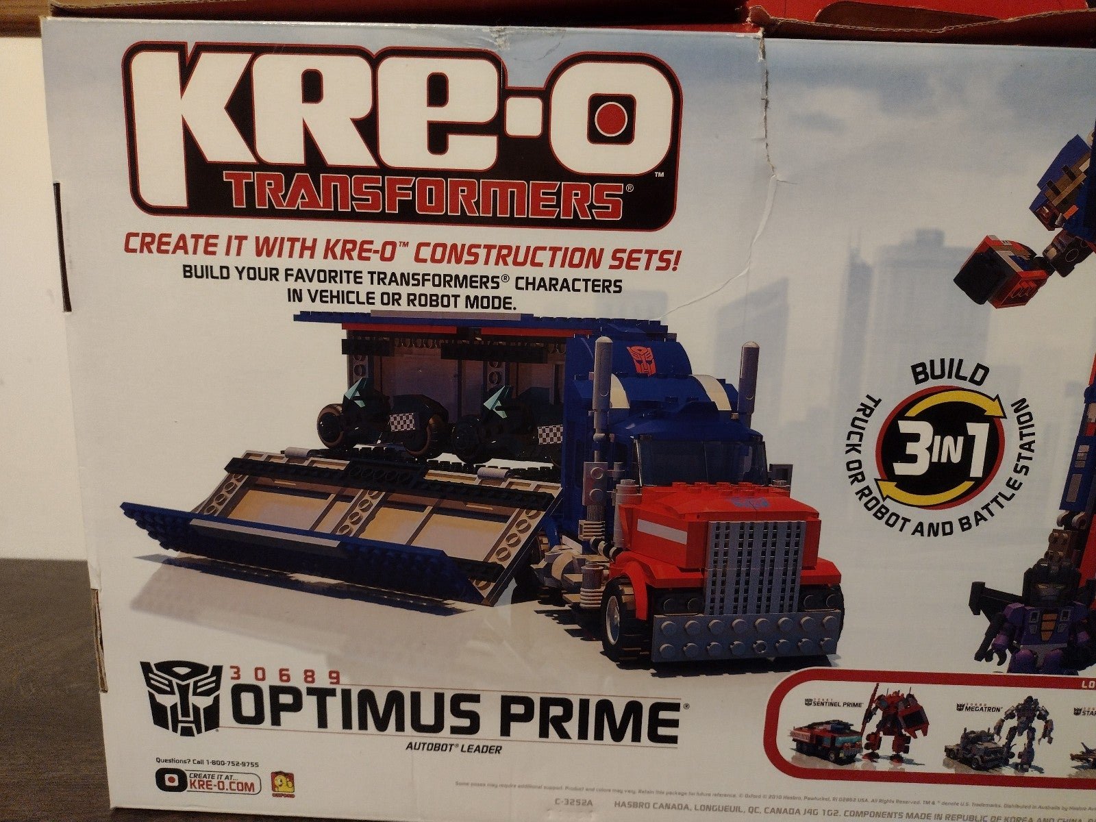 Kre-O Transformers 3-in-1 Optimus Prime Set. 542 pieces. As far as I can tell it appears to be complete. But I can't guarantee it. Sold as is. Three of the bags are still sealed. Has both manuals, stickers are unused, all figures are there. It's in really good condition except for the box. The box is damaged as pictured. Super neat set and harder to find.