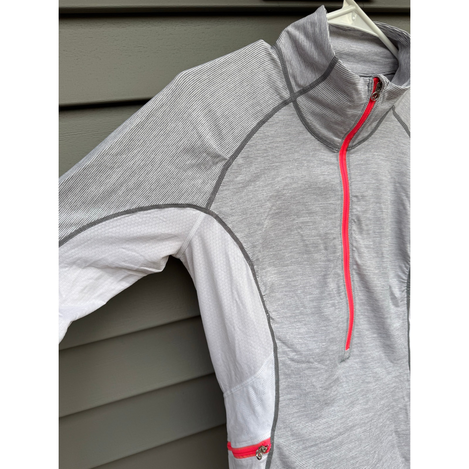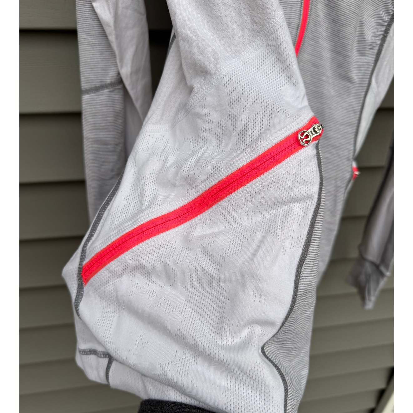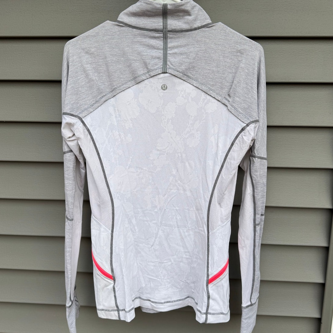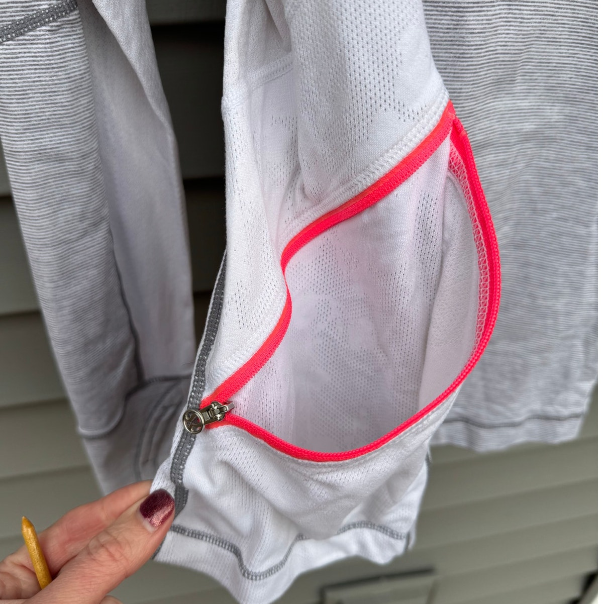 Lululemon brand, Run line, Wild 1/2 Half Zip style, long sleeve athletic shirt, lightweight, collar, great for running, golf, or other athletic activities, color/pattern called Wee Stripe White Fossil, White Flash by Lululemon brand, top is white and light gray with neon pink zippers, white portion at back has lace pattern flowered detailing, has secure zippered pockets that run from each side to back, has thumb holes, women's size 8, excellent pre-owned condition