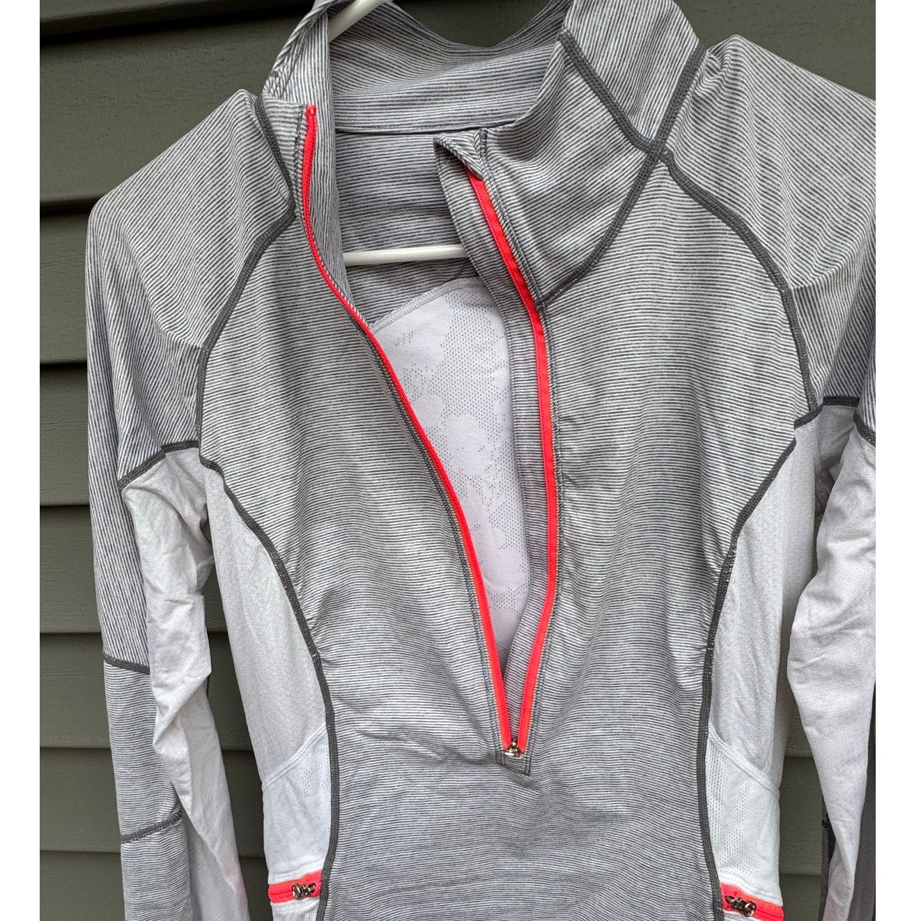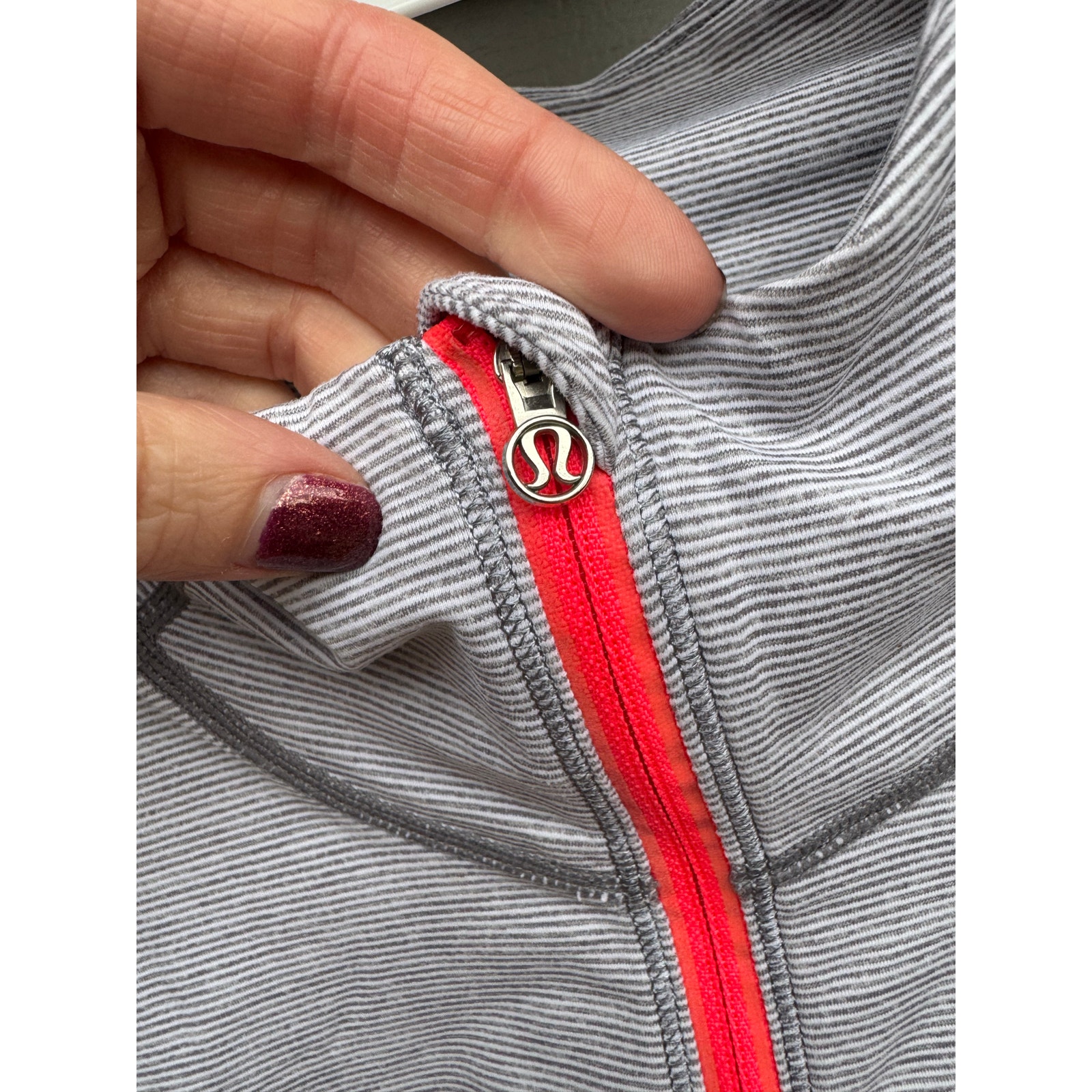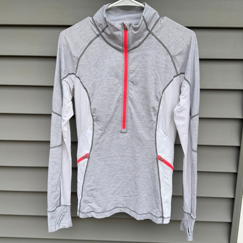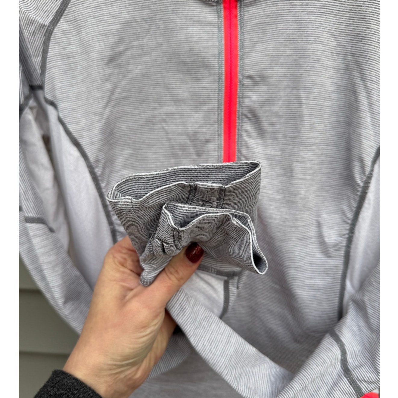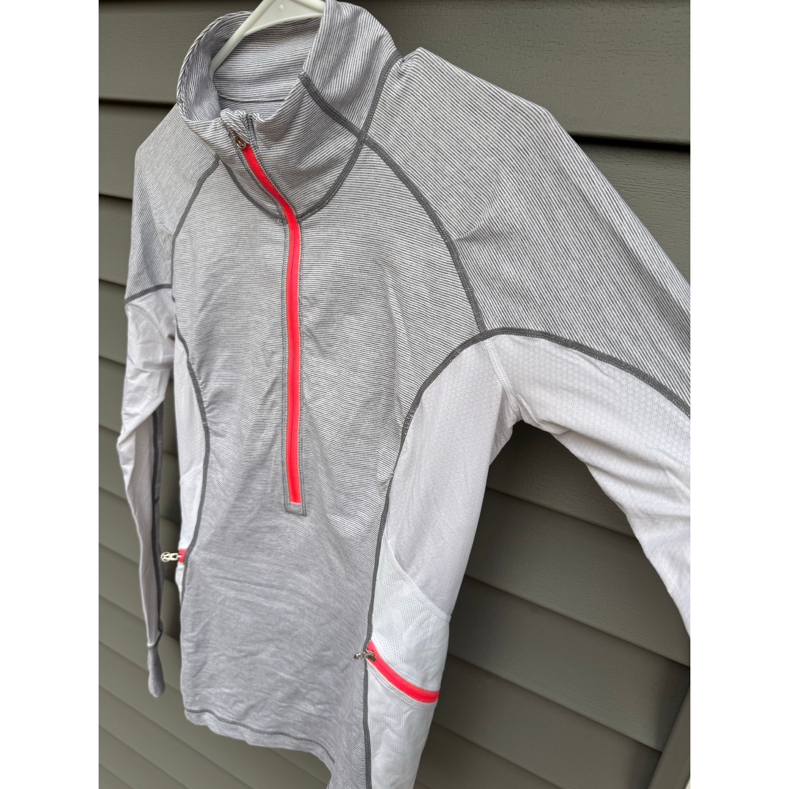 Lululemon brand, Run line, Wild 1/2 Half Zip style, long sleeve athletic shirt, lightweight, collar, great for running, golf, or other athletic activities, color/pattern called Wee Stripe White Fossil, White Flash by Lululemon brand, top is white and light gray with neon pink zippers, white portion at back has lace pattern flowered detailing, has secure zippered pockets that run from each side to back, has thumb holes, women's size 8, excellent pre-owned condition