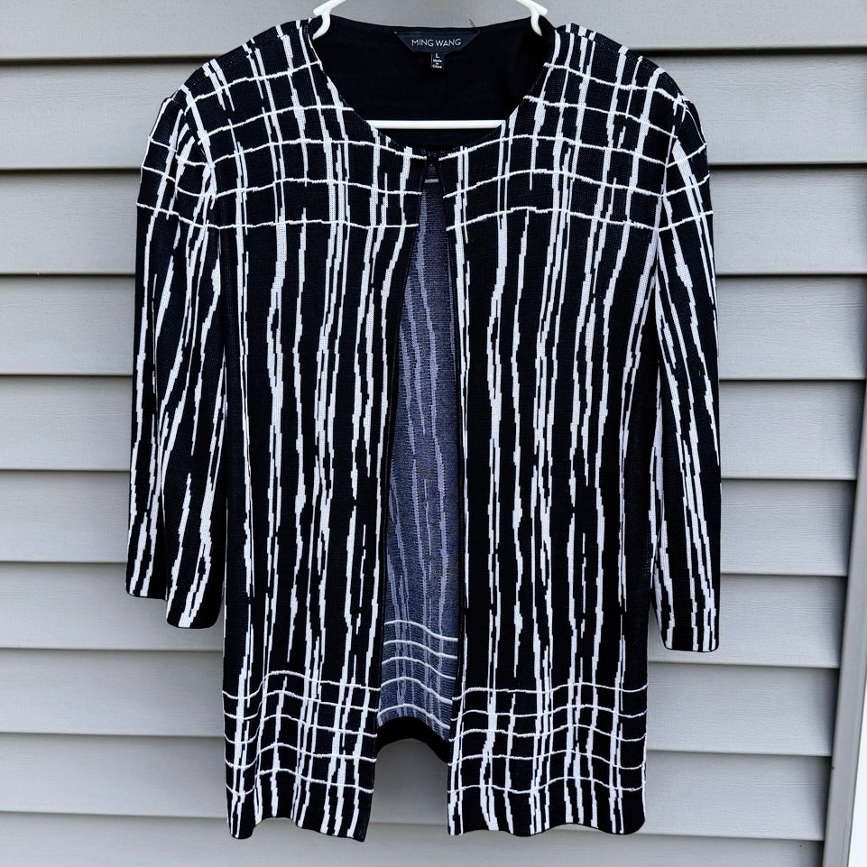Ming Wang brand, black and white abstract stripe pattern, designer cardigan sweater, 3/4 crop sleeves, clasp closure at neck or can be worn open, has shoulder pads, great addition to your fall wardrobe, but versatile for all seasons, easy piece to spruce up or tie together any basic outfit, women's size large, excellent pre-owned condition