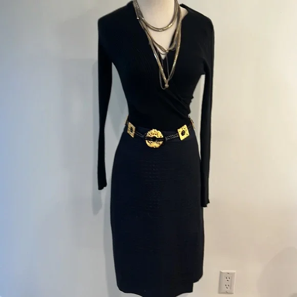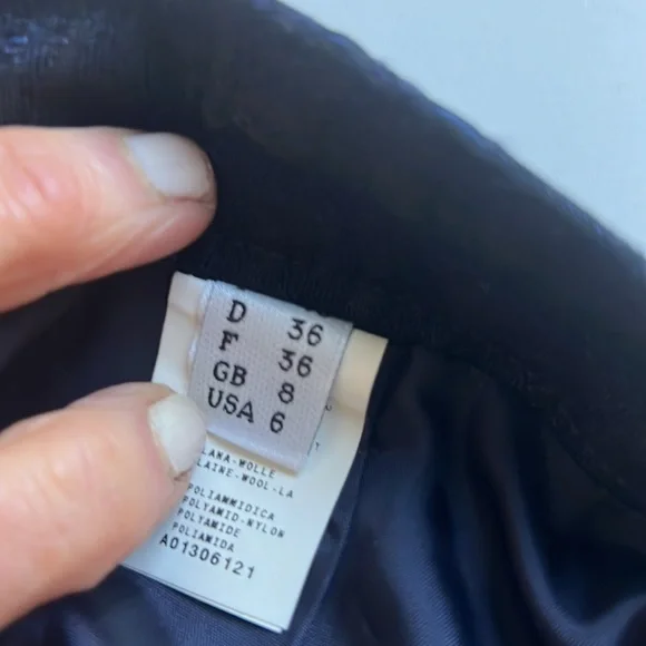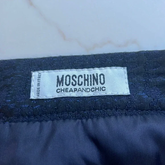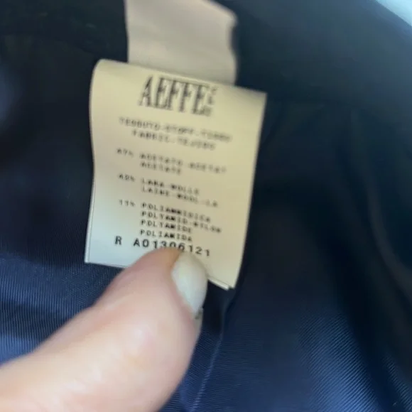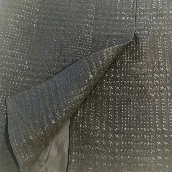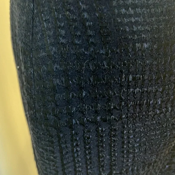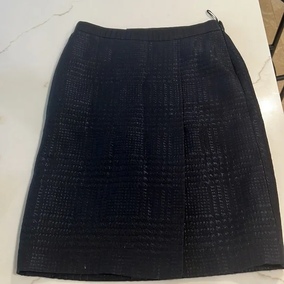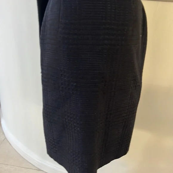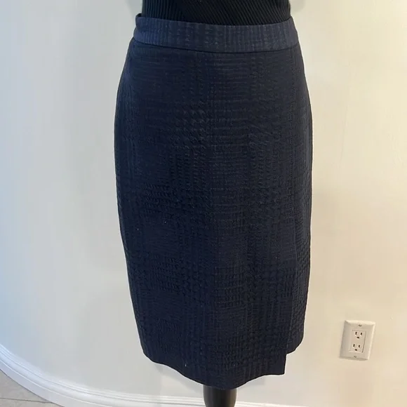 Richly textured fabric creates a plaid like pattern in the darkest navy and inky blues.Unusual front off center slit, hidden. side zipper, simple waistband that rests just below the natural waistline.Elegantly simple.Dress up or down. With chunky sweater, a sleek cashmere crew or a slinky silk blouse for a festive look.Designer Chic!! 22.25” long with 14” measures straight acrossEUC. Condition. excellent.