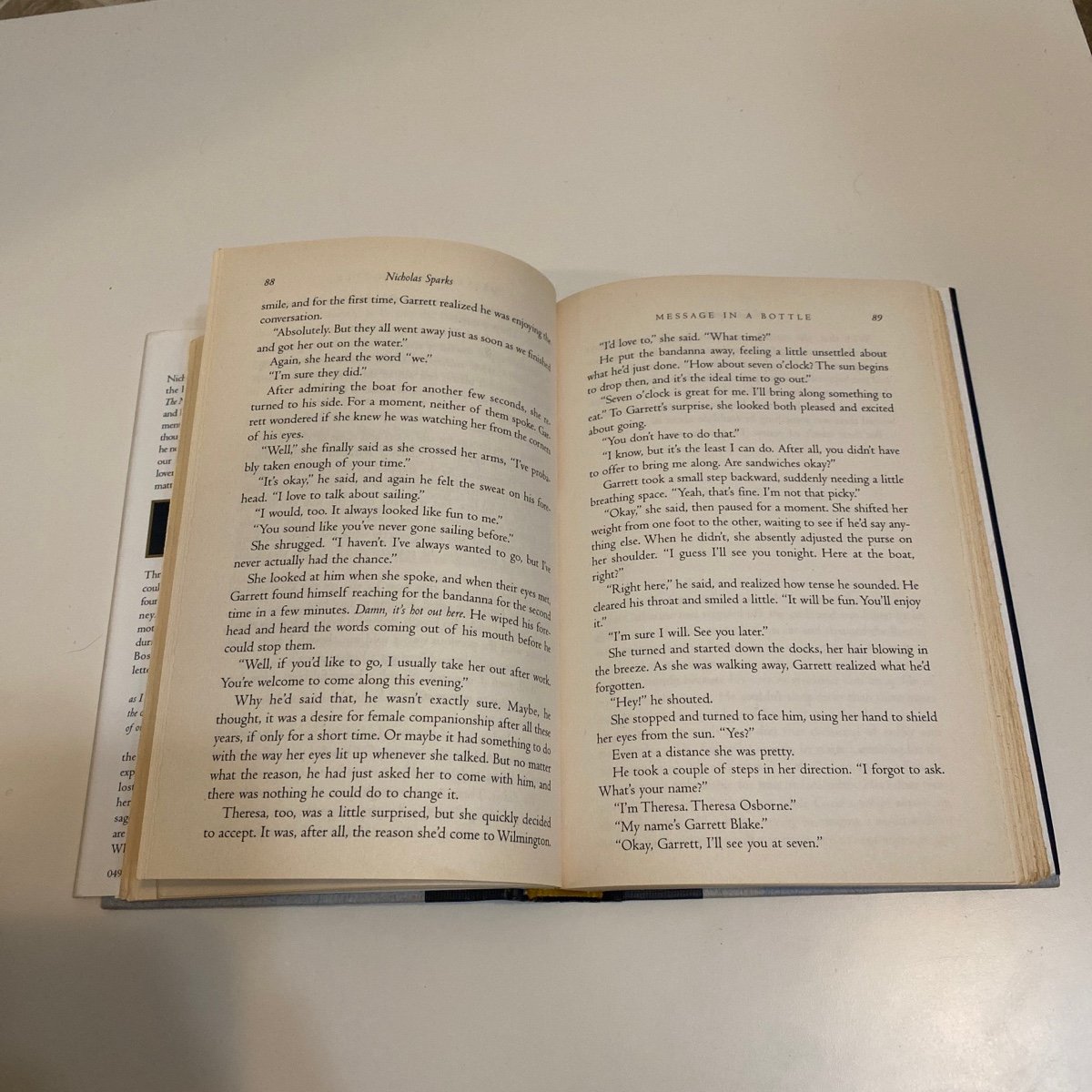 This would be a great gift for any Nicholas Spark’s fans! This is a signed (with his name only) first printing April 1998 with numbers 10 9 8 7 6 5 of “Message In A Bottle”. Book is great! Dust cover has a little stain on bottom as pictured, not bad. It does have someone’s name written in the book. One page on top has been bent down also.