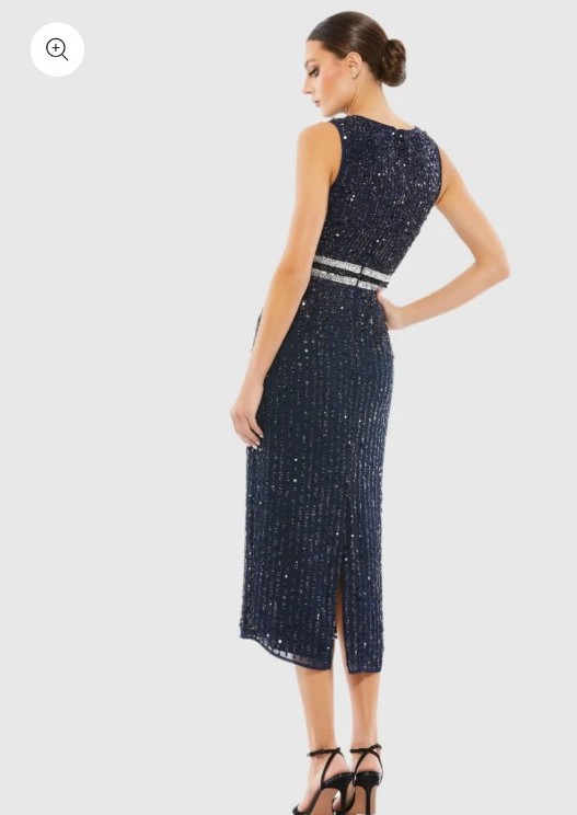 Elegant vertical-sequined sleeveless midi sheath dress with a flattering hand- beaded waist and back vent slit.