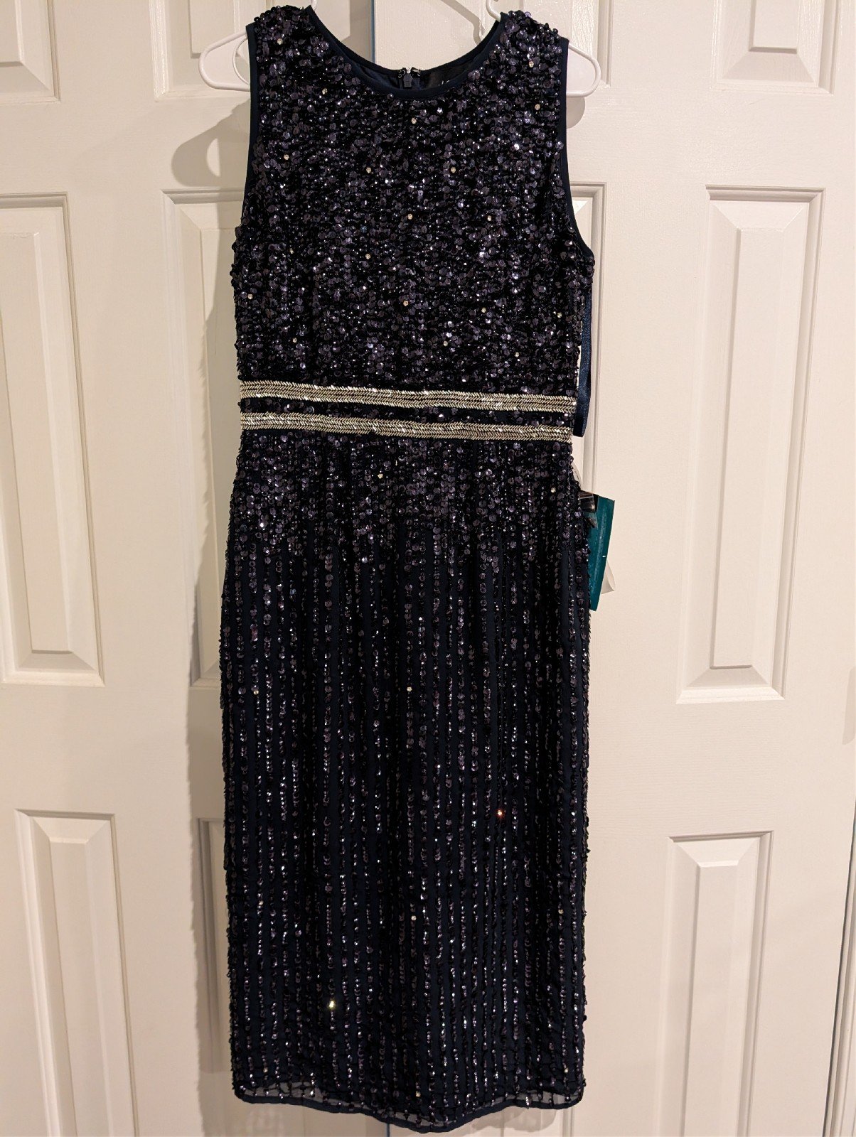 No flaws or missing sequins seen. Since it is heavily stitched through the dress, it is possible that I may have missed something. Please note due to the delicate nature of sequined dresses, some may fall off during shipping. Nonsmoking home with one fur baby; no returns or cancellations. Some items may have home-removal friendly security tag, proving it was never worn. The end just needs to be cut and clip slide off. Instructions included.