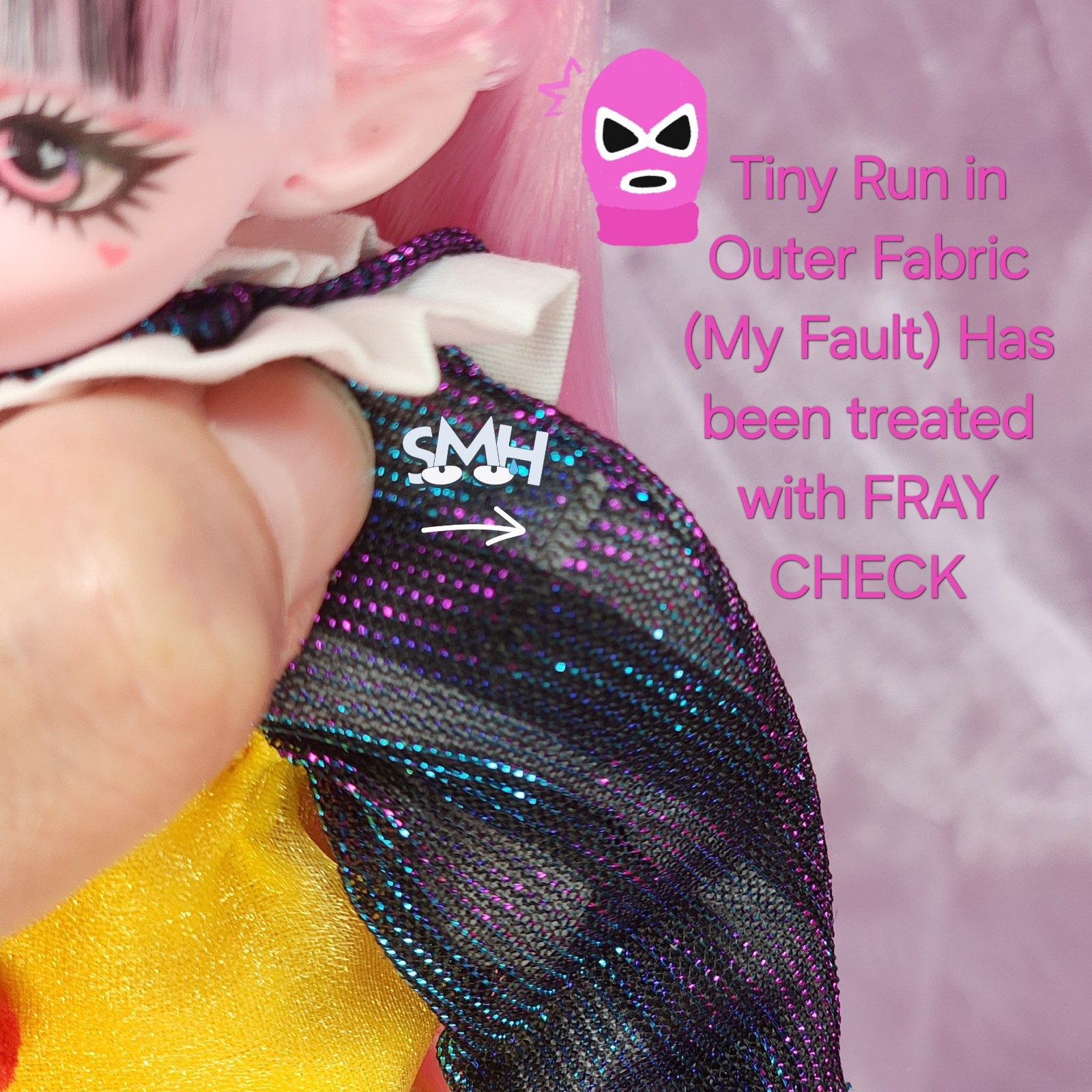 Custom 1990s Pennywise Costume for Monster High G3 Draculaura Doll. I added White Gloves and a Red Balloon to compensate for the tiny that I accidentally put in the outer sleeve fabric.