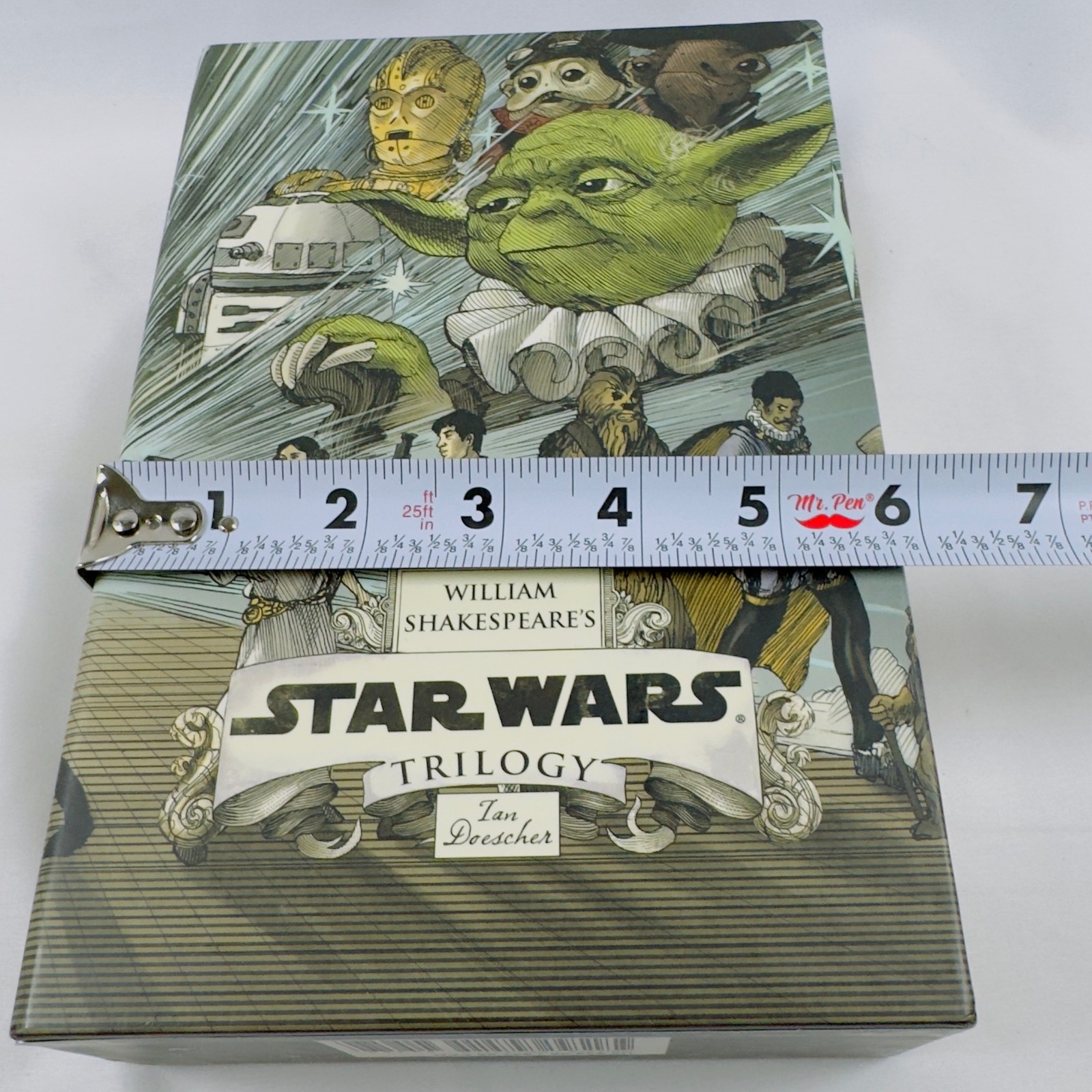 Complete William Shakespeare's Star Wars Trilogy box set, a captivating blend of classic literature and iconic science fiction. This collection reimagines the beloved Star Wars saga in the style of the Bard, featuring all three original films: *Star Wars*, *The Empire Striketh Back*, and *The Jedi Doth Return*. The set comes housed in a decorative box that includes striking artwork of famous Star Wars characters. A unique gift for both Star Wars enthusiasts and Shakespeare aficionados, offering a fresh and entertaining perspective on these timeless tales. Perfect for display on a bookshelf, a coffee table conversation starter, or for educational purposes, blending pop culture with classic literature.